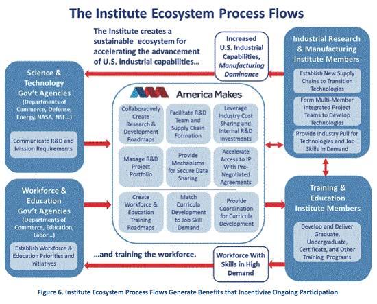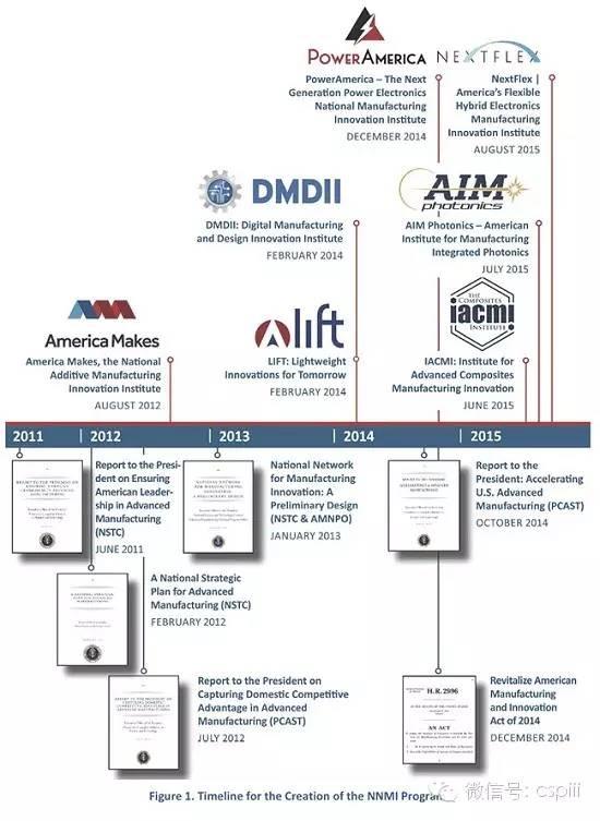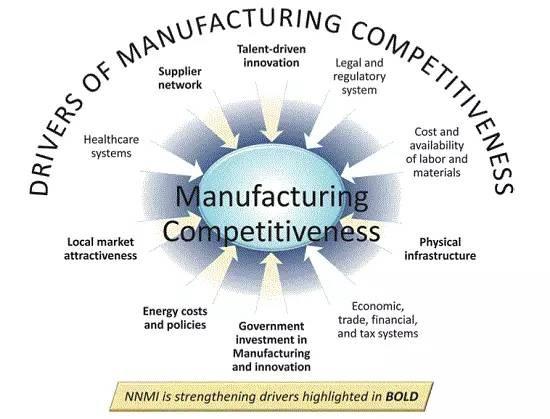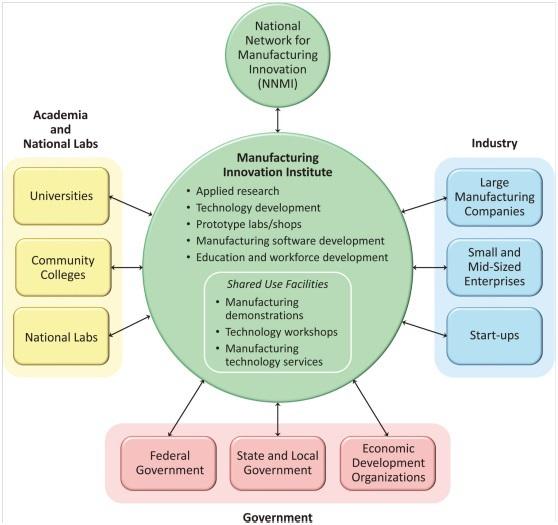 在一个高度竞争的全球市场中,仅仅依靠自发性的创新是不够的。许多国家,包括美国,都在推动创新,通过整体的政府引导方式实施。国家制造业创新网络(NNMI)旨在创造一个竞争性的、有效的和可持续发展的research-to-manufacturing科研到制造体系。目的为了使美国工业界和学术界一起解决相关产业日益浮出的挑战。《国家制造创新网络计划年度报告》中描述了该计划的历史和现状,以及各个制造创新机构的详细情况。这些机构是在2015年9月之前组建的: