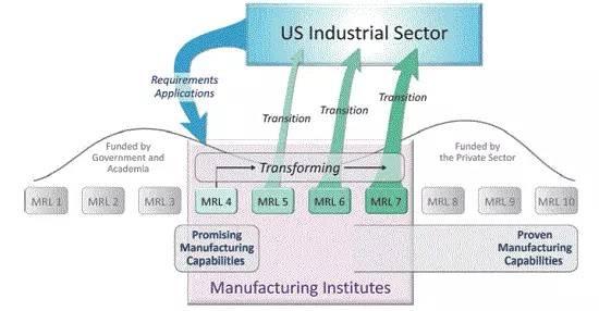 美国政府认为商业化需求与大学和国家实验室的基础研究之间存在着很大差距-技术与制造准备水平差距。而NNMI旗下的创新中心的一大战略就是缩小研发与需求的差距,加快技术转化速度。