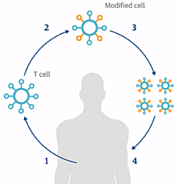 图1 CAR-T细胞免疫疗法:1. 从病人血液中分离提取T细胞;2. 在实验室中对T细胞进行基因工程改造,使其能靶向癌细胞而非自体正常细胞;3. 体外培养改造后的细胞使其增殖;4. CAR-T细胞回输进病人体内,靶向识别并杀伤癌细胞。(图片来源:Guardian