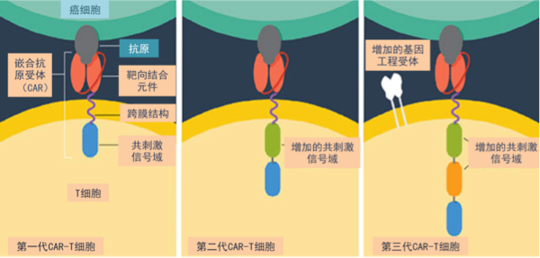 Zelig Eshhar 和 Steven Rosenberg 构建了第一代 CAR-T 细胞,他们设计的受体分子包括胞外抗体部分、跨膜结构,和胞内协同刺激信号转导结构。其中抗体部分能够靶向识别并结合癌细胞表面的特异抗原,胞内的共刺激信号转导域通过放大活性信号,激活并增强T细胞的杀伤能力。第二代和第三代CAR-T细胞增加了不同的协同刺激信号结构域,增加了能够增强靶向特异性、减弱副作用的第二个T细胞基因工程受体(图3)。简单来说,这类人造受体分子一半是单克隆抗体,一半是T细胞受体,也因此被称为嵌合抗原受体(CAR)。它结合了抗体的特异性和效应T细胞的杀伤功能,用抗体去靶向癌细胞,用T细胞去杀死癌细胞。